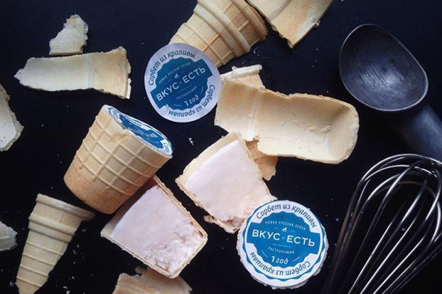 В русском ресторане «Вкус есть!» стаканчик мороженого выглядит как самый обычнейший пломбир, только немного поменьше. Но его внешность обманчива. Внутри — сорбет из крапивы: соединенные белок и кордиал из крапивы, кислый сироп на основе сушеных листьев крапивы.