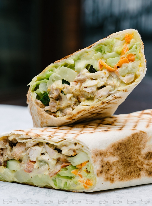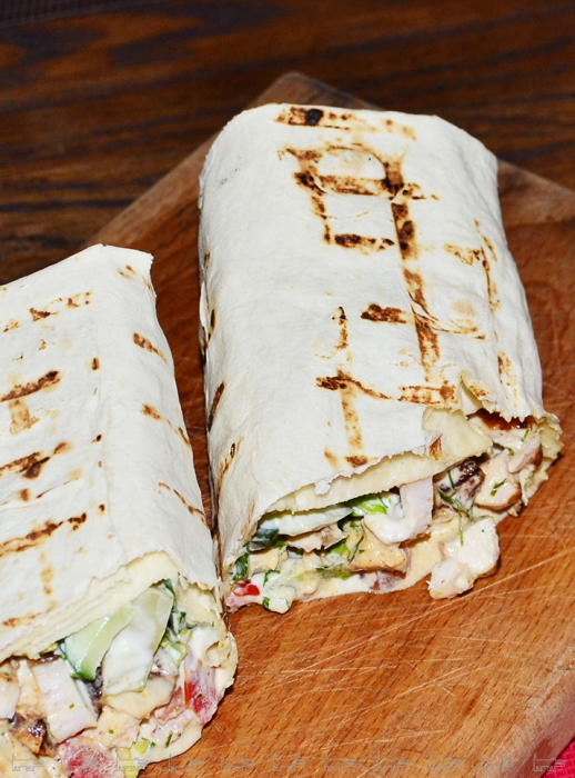 Обжариваем лепешку на гриле — подойдет пшеничная, ржаная или кукурузная. Выкладываем на нее полосками кусочки курицы, огурцов, помидоров и листья испанского мини-салата и сворачиваем. Добавляем соус — майонез на перепелиных яйцах с оливковым маслом, горчичными зернами и смесью специй во французском стиле.