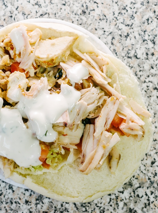 Маринуем куриное филе с майонезом, паприкой, луком, чесноком и кориандром и обжариваем над углями. Для соуса соединяем домашний майонез из оливкового масла, лимонный сок и чеснок с нежирной сметаной, чтобы заправка была полегче. Завернув нарезанное мясо, огурцы, помидоры и салат ромейн в лаваш размером 60 на 80 сантиметров — снова на гриль на две минуты.