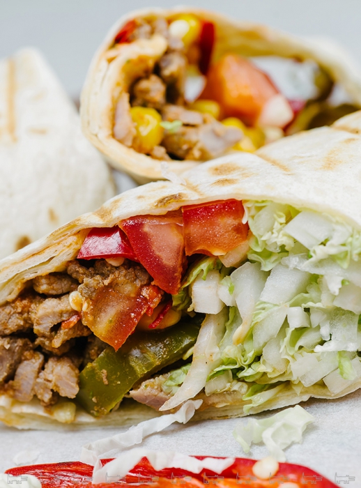Держим говядину в маринаде из чеснока и чили, рубим и обжариваем ее на сковороде с кукурузой и соусом сальса (измельченные томаты, лук, черный перец и листья кориандра). Выкладываем мясо на пшеничную тортилью, добавляем пекинскую капусту, помидоры, слайсы перцев чили и халапеньо. Заворачиваем и получившийся врап обжариваем на гриле.