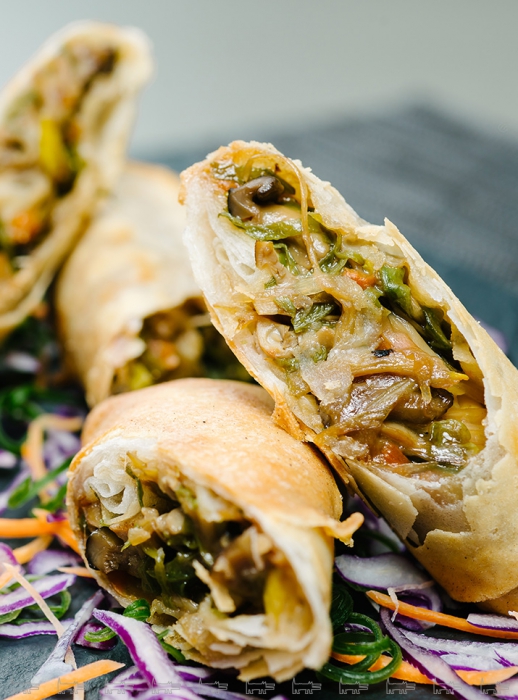 Стручки зеленого горошка, сельдерей, морковь, шампиньоны, грибы шиитаке и цаогу режем и с ростками сои бланшируем. В воке обжариваем на пальмовом масле красный лук, чеснок и имбирь, затем выкладываем туда овощную смесь и вливаем куриный бульон, устричный соус, соевый соус, кунжутное масло и рисовое вино. Тушим, охлаждаем, закручиваем в плотный ролл с пшеничным тестом и жарим во фритюре.