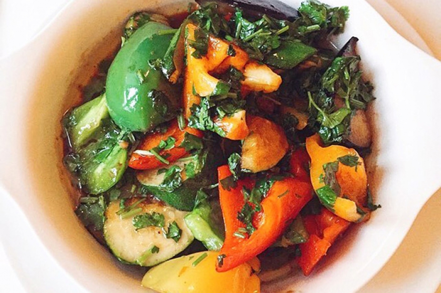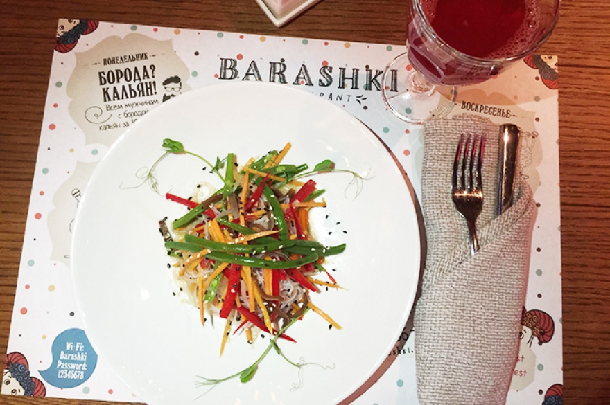 Интересный, с азиатским характером салат изобрели в ресторане Barashki. Стеклянная лапша фунчоза и ледяные грибы, замачиваются, затем последние режутся тонкой соломкой, добавляют нарезанные овощи — болгарский перец, морковь, огурец, стебель сельдерея, а дальше — соусы: соевый и яркий кисло-сладкий тонкацу.