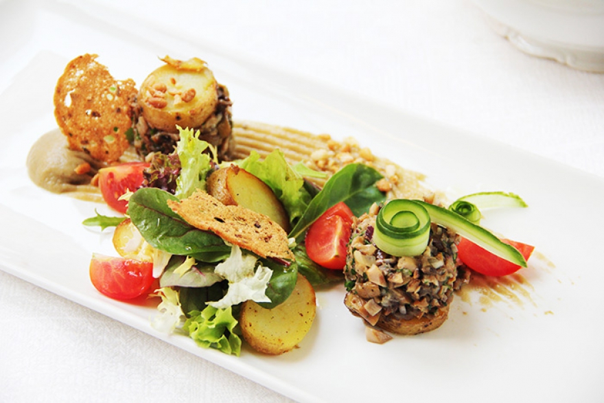 Жемчужина постного меню в «Северянине» — грибной тартар. Шампиньоны обжаривают с чесноком и тимьяном, нарезают и смешивают с красным луком, ворчестером, трюфельным маслом, тимьяном, кинзой и петрушкой. На тарелке все это соединяется с пюре из баклажанов, молодым картофелем, свежим огурцом, черри, листьями салата и сухариками. Также с грибами здесь делают солянку и гречневые котлеты и рагу из бобов.