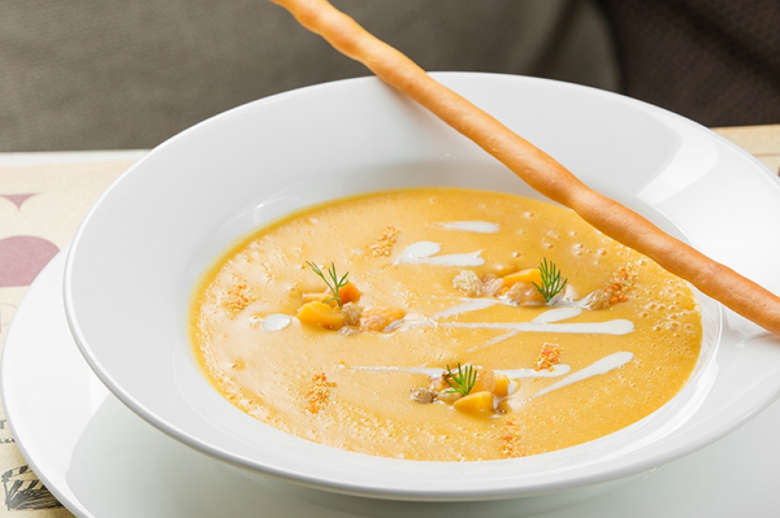 В ресторане Arka. Bar & Grill кормят супом — чемпионом по питательности. В его состав входит булгур, чечевица, морковь, картофель, лук, чеснок, карри, томатная паста, овощной бульон и кокосовое молоко. В готовый суп добавляют еще курагу и изюм, украшают его мандариновой пудрой и подают с гриссини.