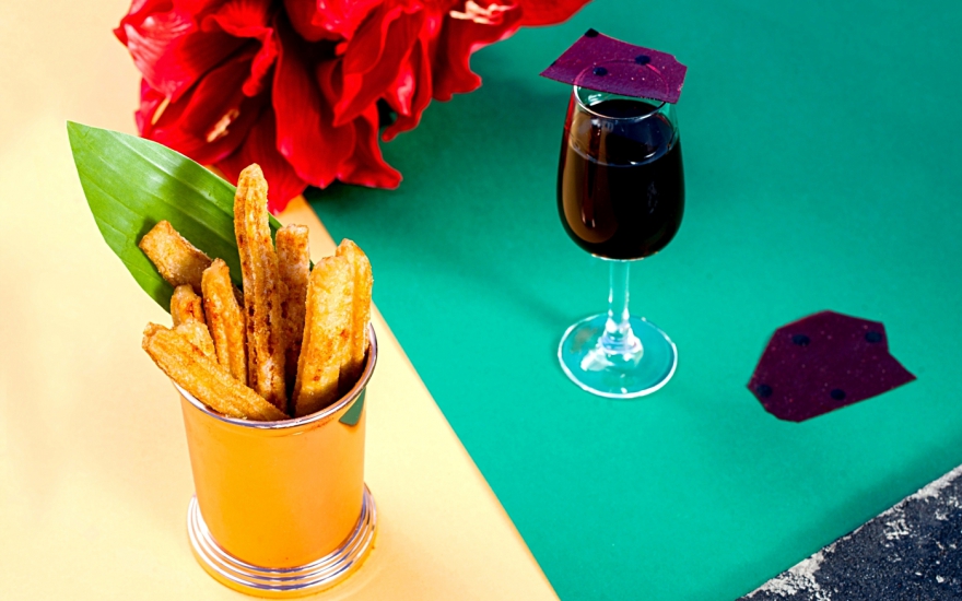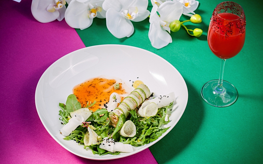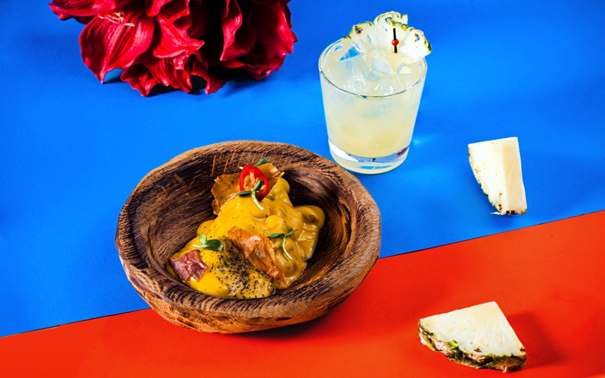 Открывают сет печеночные пальчики с луковым соусом и ягодным желе в сопровождении Mezkal Margo на основе копченого мескаля с фиалковым сахаром и ванильной солью. Далее — аргентинские пирожки эмпанадас с телячьими почками и куриными сердечками с копченой сметаной и оливковой пудрой: к этой аутентичной закуске подобрана пряная Bloody Maria на основе текилы и сангриты. Третий курс — салат с крабом и куриными желудочками, завернутый в слайсы огурца: его летнюю свежесть обрамляет твист на Peruvian Bellini с клубничным пюре. Последнюю закуску — тако с тушеными бычьими хвостами на домашней кукурузной лепешке — смягчает медовая кашаса со свежим шалфеем в коктейле Sage Capirinha. Как основное блюдо идут куриные сердечки с говяжьим желудком, обжаренные и томленые в бульоне, с обожженным ананасом и муссом из батата и кокосового молока. Вкус этого блюда уже является частью коктейля — оно подается с Pino Colada — Old Fashion: тропическим лонг-дринком на двух видах рома с кокосовой водой и ананасовым сиропом. Традиционному десерту чуррос, воздушному тесту с пудрой и копченой паприкой плюс шарик ромового мороженого с малиновой крошкой, компанию составит взрывное сочетание горького, пряного, сладкого, острого и терпкого — коктейль El Presidente с ромом, жженым сахаром и вермутом на перце.