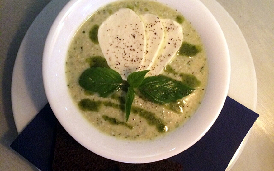 Холодный томатный суп в Jerome с нежной моцареллой буррата и неаполитанским базиликом: простая, но здорово исполненная классика — базилик, между прочим, растет прямо в ресторане.
