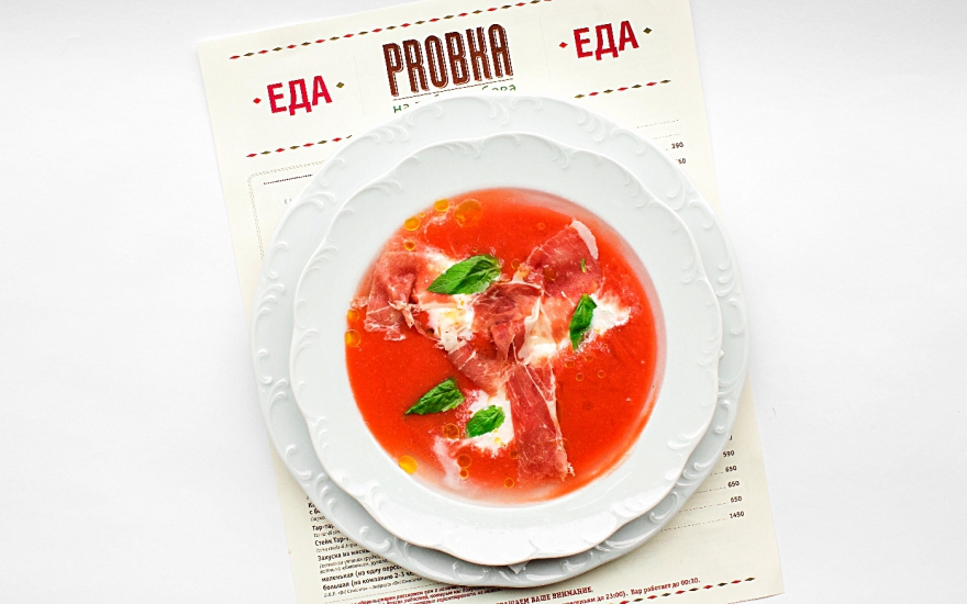 Фирменный рецепт Антонио Фреза для «Пробки» — безупречно приготовленный классический суп из томатов, который подается в тарелке под тонкой корочкой льда. «Ледяная» тарелка делается так: для этого посуду для супа заполняют водой, ставят в морозильник, пока сверху не появится ледяная корка. Аккуратно ее пробивают в одном месте и сливают воду, которая еще не замерзла под ней. Под лед вливают суп из блендера — для этого, например, можно использовать кондитерский мешок с самой крупной насадкой. Сверху сбрызгивают оливковым маслом и кладут несколько ломтиков пармской ветчины со свежей бурратой.