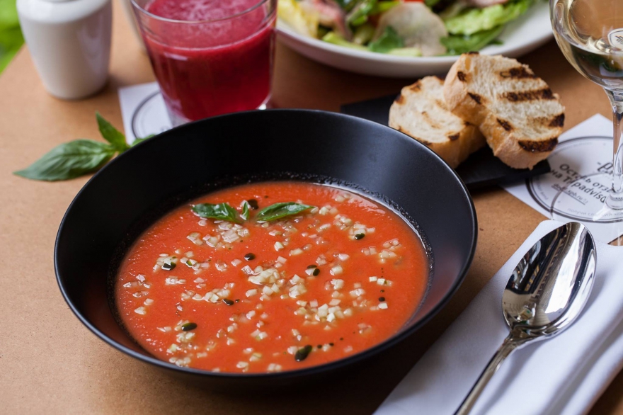 В «Компании» один из правильных традиционных испанских холодных супов — он делается из перетертых свежих томатов, огурцов и сладкого перца с добавлением чеснока, итальянской чиабатты и базилика. Есть как классический вариант, так и с мясом камчатского краба.