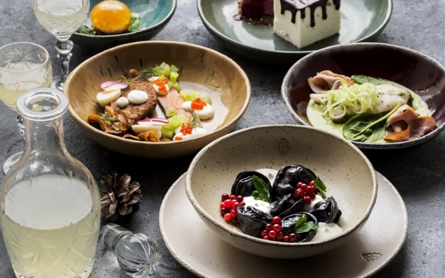 - На выбор: тартар из говядины с пхали, горчицей и льном или севиче из форели с кремом из лимона
