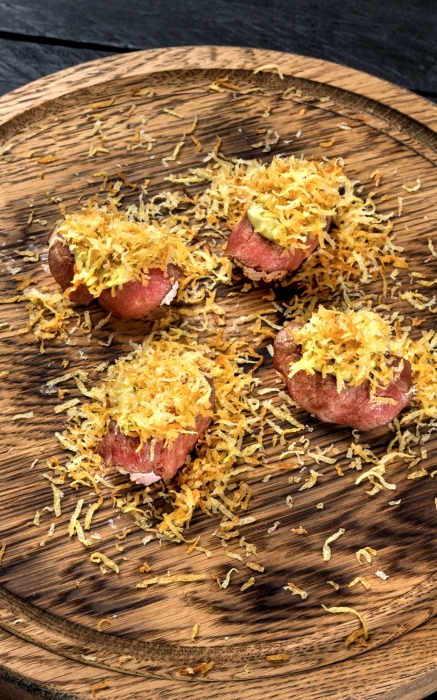 Суши с рыбой — вечная классика. Но в ресторане «Мясо в огне», что работает внутри ресторана Food Park в Александровском парке, их делают с мясом — из риса жасмин и говядины травяного откорма: обжигают прямо при госте, добавляют крем из брокколи и посыпают хрустящей картофельной стружкой.
