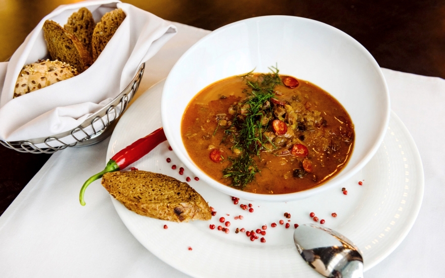 В «Блоке» смело решили соединить два хитовых супа — русскую солянку и азиатский том ям. От русской части в ингредиентах значатся положенные соленые огурцы, говяжий язык, грудинка и охотничьи колбаски; от азиатской — собственно паста том ям и кокосовое молоко, листья лайма и лемонграсс. Сказать, что суп имеет интересный насыщенный вкус — не сказать ничего.
