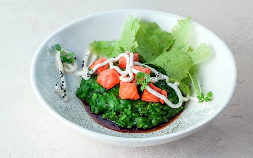 Бьющий продажи в «Сырнике» ролл переиначили на итальянский лад — формально оставив все базовые ингредиенты этого японского блюда. Для ризотто берут премиальный рис акварелло и варят с водорослями нори, отчего ризотто становится изумрудным, сверху выкладывают кусочки лосося в соусе унаги. Венчает ризотто сливочный сыр, для украшения и дополнительного волнения — рисовые чипсы, измельченный нори и черный дробленый кунжут.