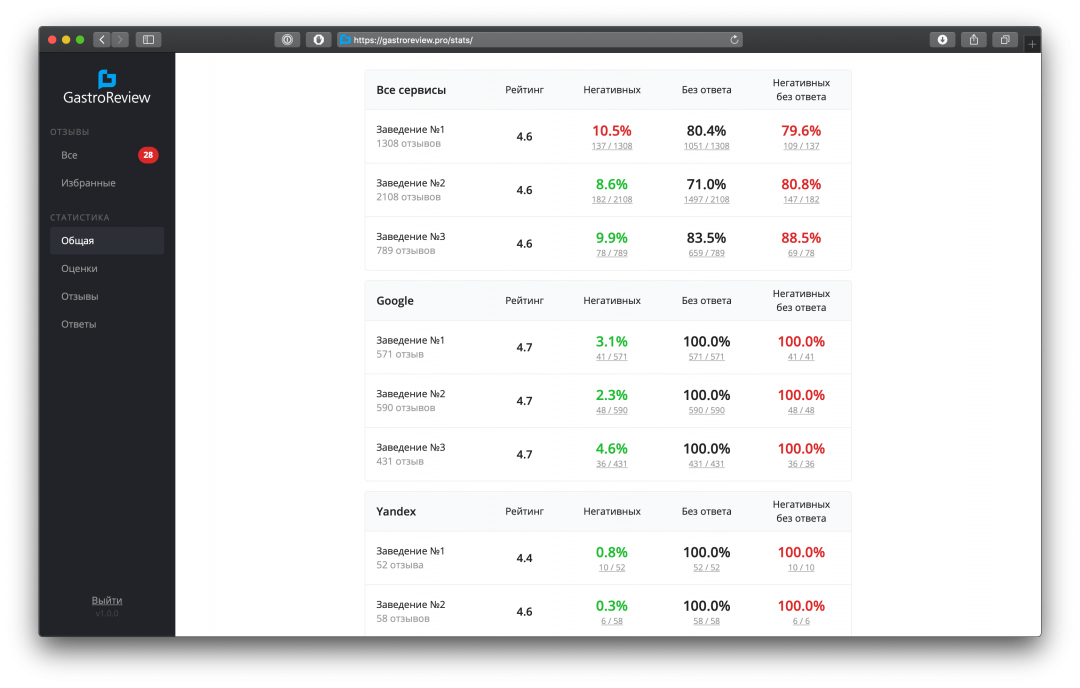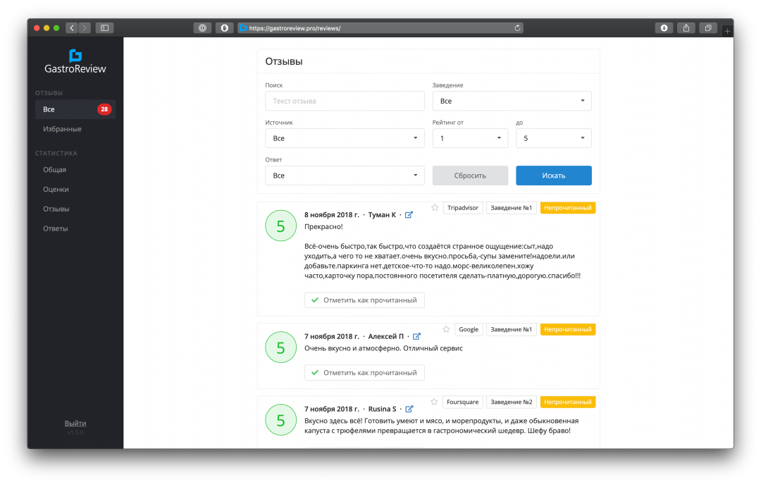 К сервису подключены Google, «Яндекс», Tripadvisor, Foursquare, Restoclub, «Афиша», Flamp, «2ГИС» и Zoon. Отзывы выводятся в виде списка с возможностью фильтрации по заведению, ресурсу, средней оценке и другим характеристикам.