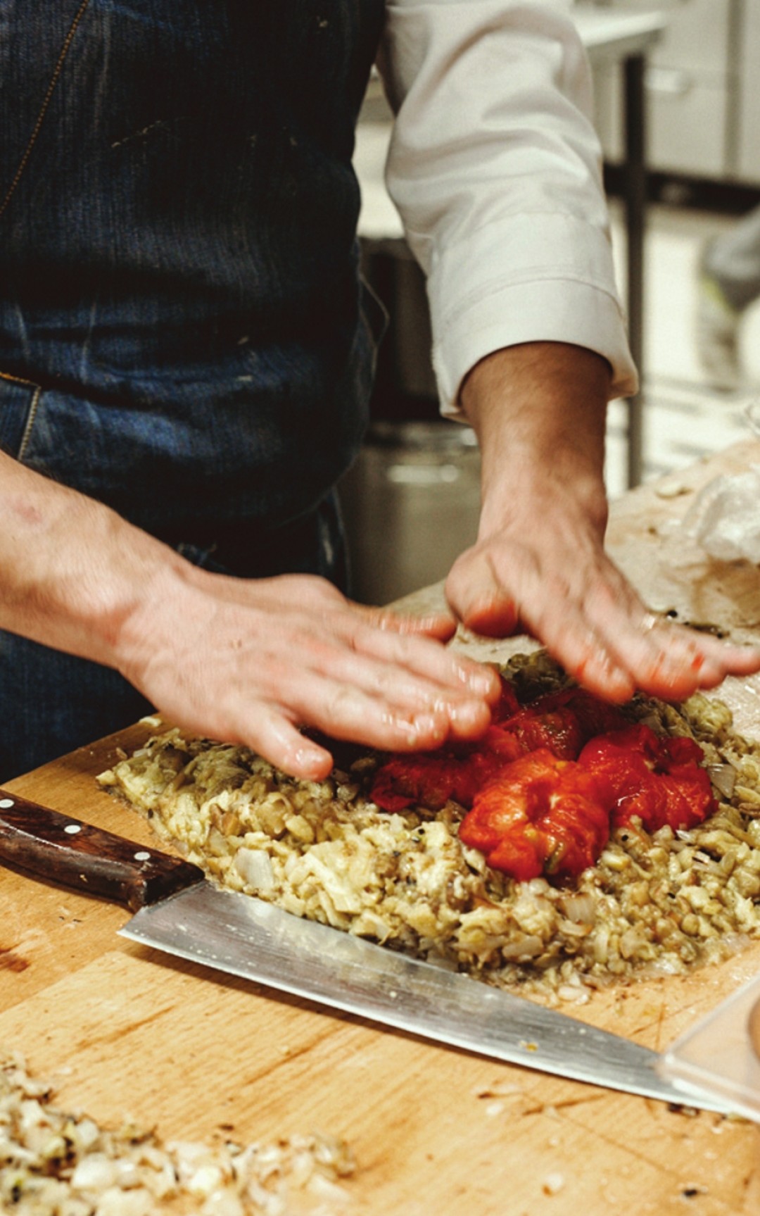 Домашние блюда на Nativa подают не церемонными ужинами с сет-меню, а как Oggi — предложение дня из нескольких позиций. Формат подсказала Наталья: «Инкороната Пальма, мама бренд-шефа Probka Family Антонио Фреза, должна была готовить закрытый ужин в „Квартире“ в „Пробке“. Когда она уже летела из Тосканы с чемоданами, набитыми чикателли, мы говорили с Арамом по телефону, и я предложила перепечатать меню ужина с ценами за отдельные блюда, а не за сет и раздать всем гостям. Сказала открыть двери „Квартиры“: пусть красотка Инкороната обаяет всех. Арамчик был недоволен, но потом перезвонил и признал, что идея сработала. Получилось живо и тепло, а сценарий того вечера стал прообразом всех событий Nativa».