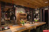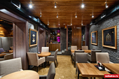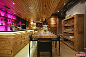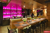 На уют работает и обилие дерева. Порталы сделаны из дубового шпона, потолок и стены оформлены тонированной сосной. Все пространство барного зала занято большим столом из массива балийского дерева (сделанным на заказ, как и почти вся остальная мебель и элементы отделки), за ним легко разместится большая компания. Модные акценты расставляют текстиль Missoni и работы актуального фотохудожника Кимико Йошиды на стенах.