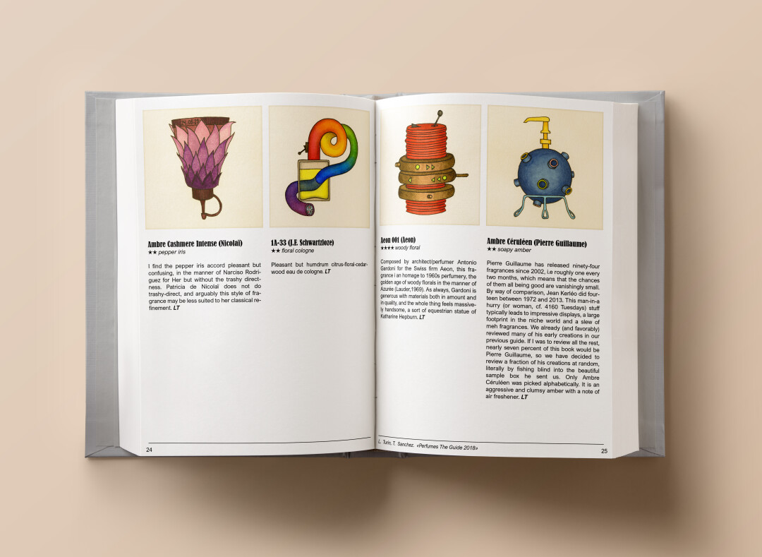 Наверное, главный источник вдохновения нежно любимая мной книга Codex Seraphinianus (книга, написанная и проиллюстрированная итальянским архитектором и промышленным дизайнером Луиджи Серафини. — Прим. ред.) — это как раз тот случай, когда книга не только источник информации, но и эстетический объект. Именно этого мне не хватило при чтении «Парфюмерного гида». Конечно, какие-то старинные флаконы духов, или интересные предметы дизайна тоже бывают референсами. Я даже дополняю публикацию изображением, близким к иллюстрации, но как правило подбираю эти картинки уже после создания собственного рисунка. А в момент творческой работы стараюсь все-таки брать что-то из самого текста, искать ассоциации со словами или брендом.