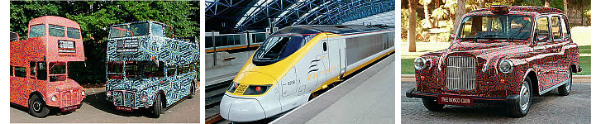 | В районе Ватерлоо-плейс можно поймать дабл-деккер, раскрашенный в узоры BOSCO. | Из центра Лондона курсирует скоростной поезд, который всего за семь минут доставляет до Стратфорда, где находятся главные объекты Олимпийского парка. | Паттерны BOSCO перенесли и на городские такси, для которых на время Олимпиады выделены отдельные дорожные полосы. |
