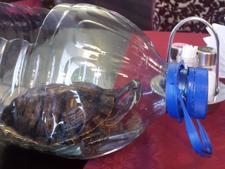 Но Майя уже устала от впечатлений и смотрела на мир, прижавшись мордочкой к стенке бутылки. Решили не пересаживать. Зато я заметила, что, пока её носила, часть воды выплеснулась мне на куртку. Пришлось повторить опыт из первого заведения. Повар принёс полную кружку воды и внимательно проследил, как я долила её черепахе.