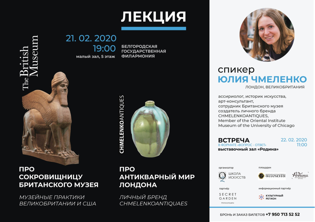 В конце февраля в Белгород с лекцией приедет Юлия Чмеленко – ассириолог, aрт-менеджер, историк искусств, сотрудница Британского музея и создательница личного бренда chmelenkoantiquaes. Темы ее выступления – сокровищница Британского музея и антикварный мир Лондона.