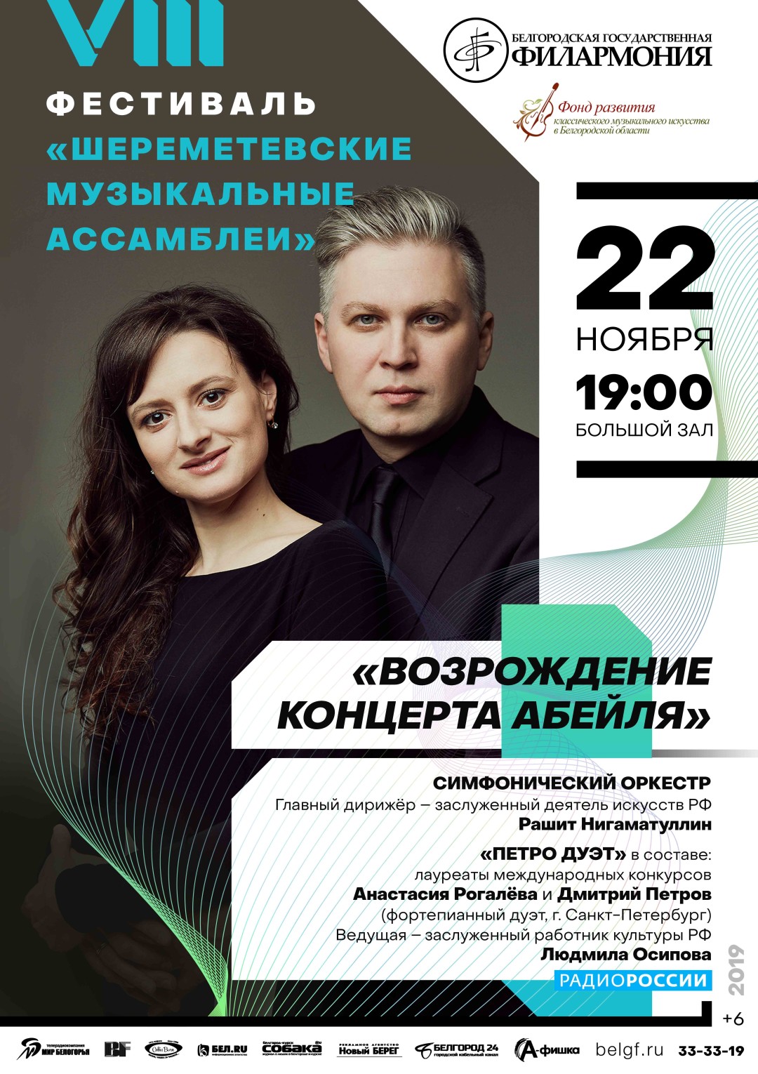 22 ноября в 19:00 в Большом зале Белгородской филармонии откроется VIII фестиваль «Шереметевские музыкальные ассамблеи». Событие проходит при поддержке Фонда развития классического музыкального искусства в Белгородской области.