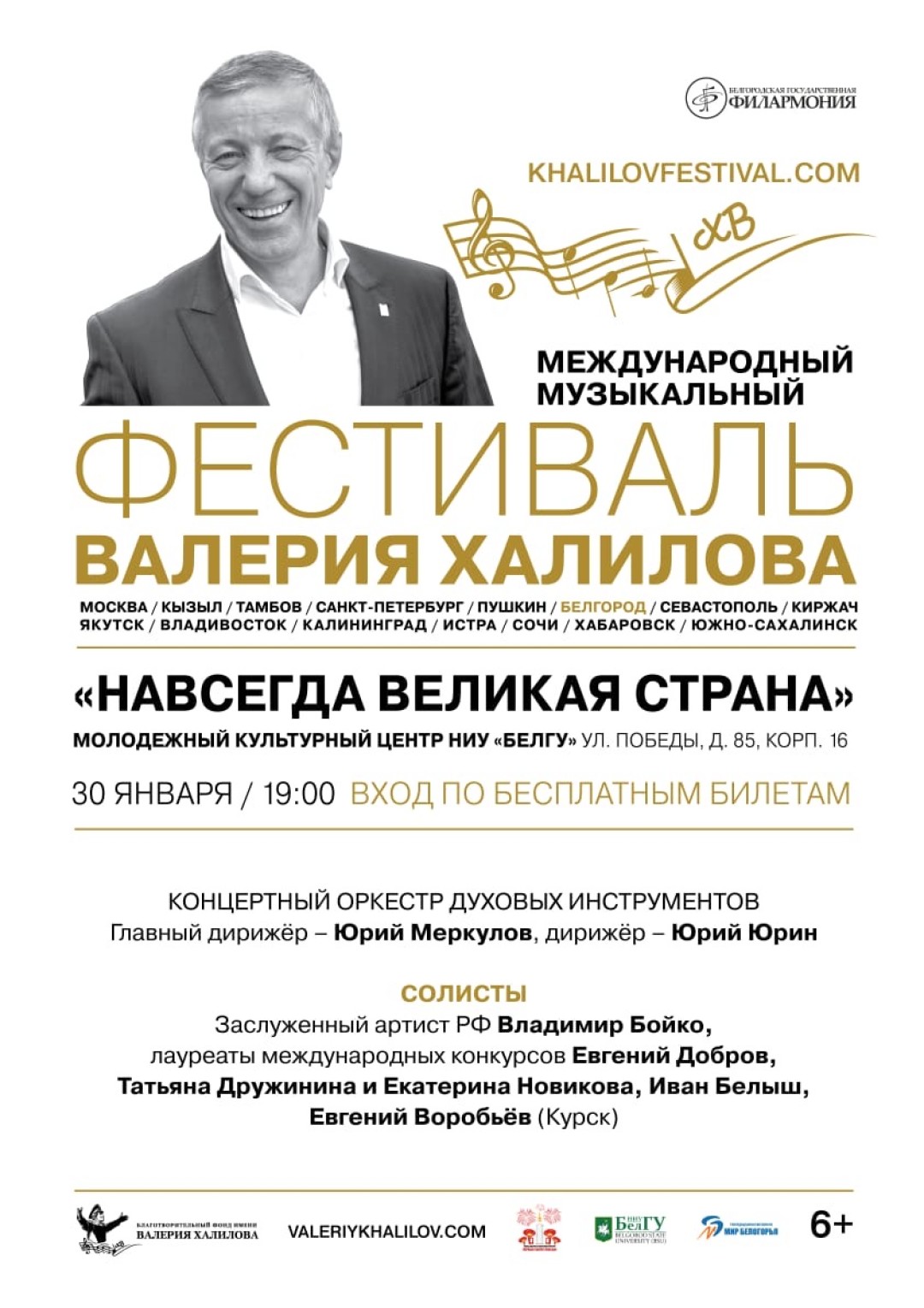 30 января музыканты Белгородской филармонии присоединятся к Международному музыкальному фестивалю памяти народного артиста России Валерия Халилова. Он организован Благотворительным фондом имени Халилова, а его идея – в год празднования 75-летия Победы показать особую роль духовой музыки в утверждении национальных традиций патриотизма, духовной преемственности и уважительного отношения подрастающего поколения к памятным страницам отечественной истории.
