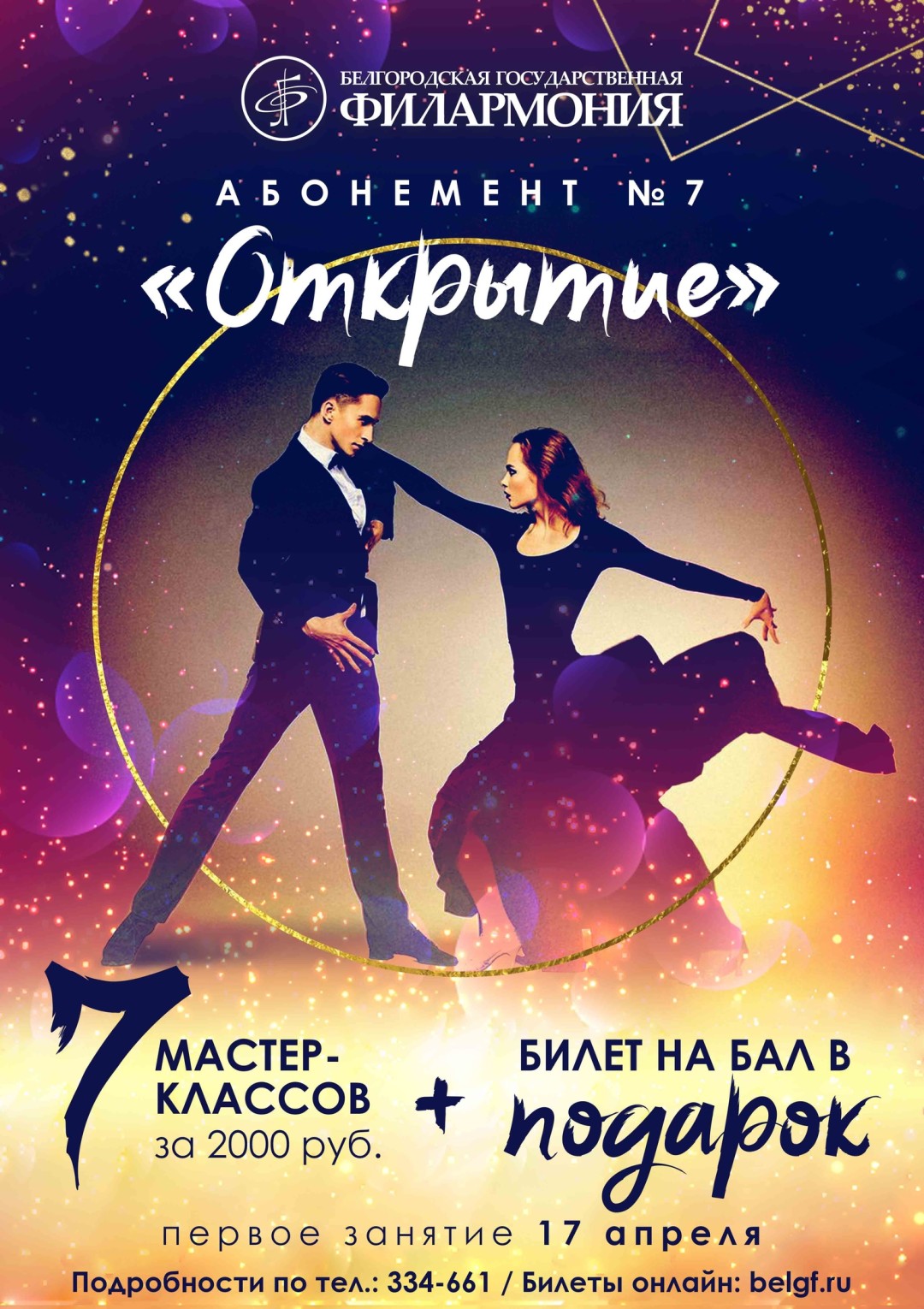 Абонемент № 7 «Открытие» включает семь мастер-классов по различным танцевальным направлениям. В подарок покупатель абонемента получает две репетиции и посещение самого волшебного события филармонии — зимнего бала «Открытие», который состоится 15 декабря.