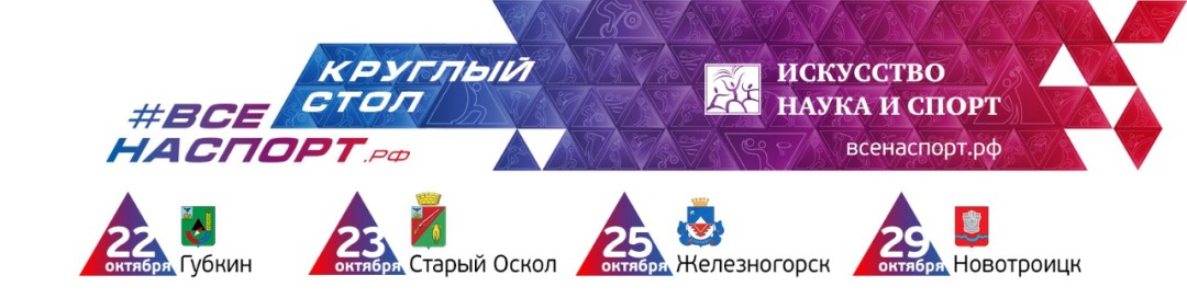 Круглые столы пройдут во всех городах, в которых реализуется спортивный проект #ВСЕНАСПОРТ. Откроет цепь встреч с общественностью Губкин. Круглый стол там состоится 22 октября в малом зале Центра культурного развития «Форум». Начало – в 9:30. 23 октября в 9:30 бурные обсуждения перенесутся в Центр молодежных инициатив Старого Оскола. 25 октября наступит очередь города Железногорска Курской области. Там круглый стол пройдет в малом зале Дворца горняков, начало – 9:30. Завершающим станет круглый стол в Новотроицке. Он состоится 29 октября в актовом зале Центра развития творчества детей и юношества. Начало – также в 9:30.