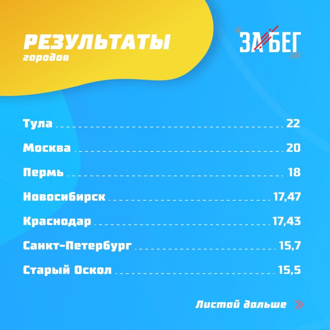 Старый Оскол набрал 15,5 баллов и вошел в десятку самых спортивных городов России по версии ЗаБег.РФ. Он уверенно обогнал несколько городов миллионников, и всего 0,2 балла его отделило от Петербурга.