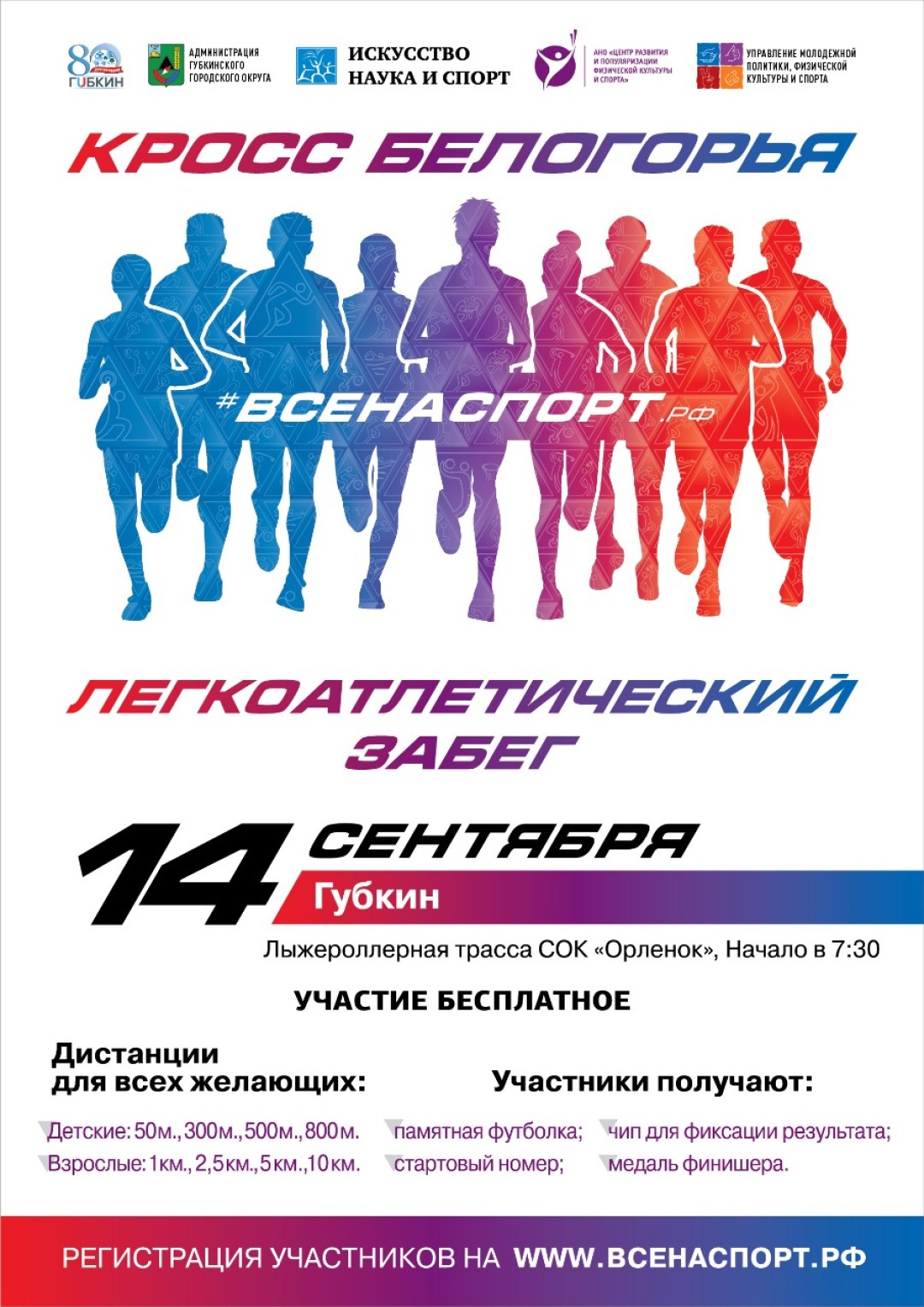 14 сентября в Губкине пройдет «Кросс Белогорья» посвященный 80-летию основания города. В планах организаторов – привлечь более 1000 любителей бега. Для спортсменов подготовлены трассы в 1; 2,5; 5 и 10 километров, а для совсем юных участников разработаны дистанции 50, 300, 500 и 800 метров. Все участники забега получат памятные призы и подарки.