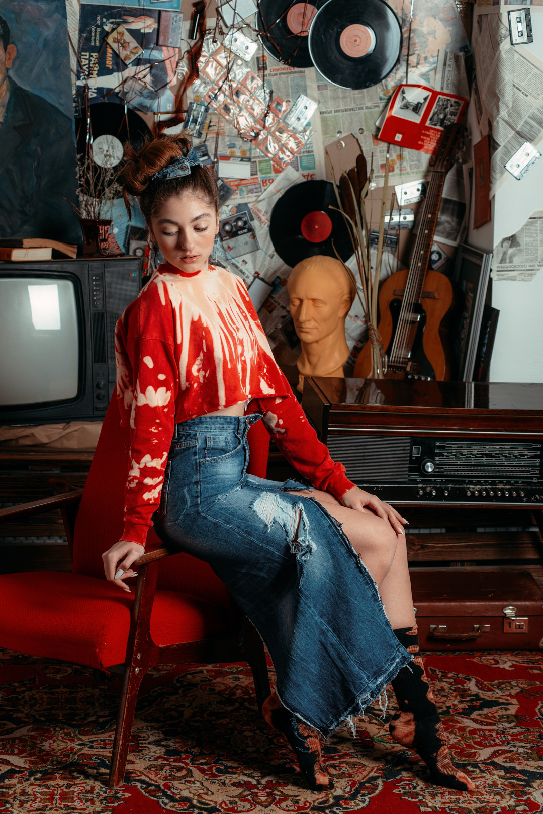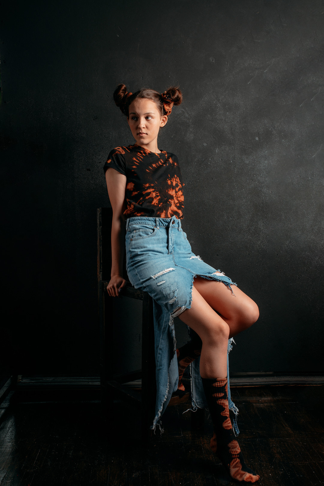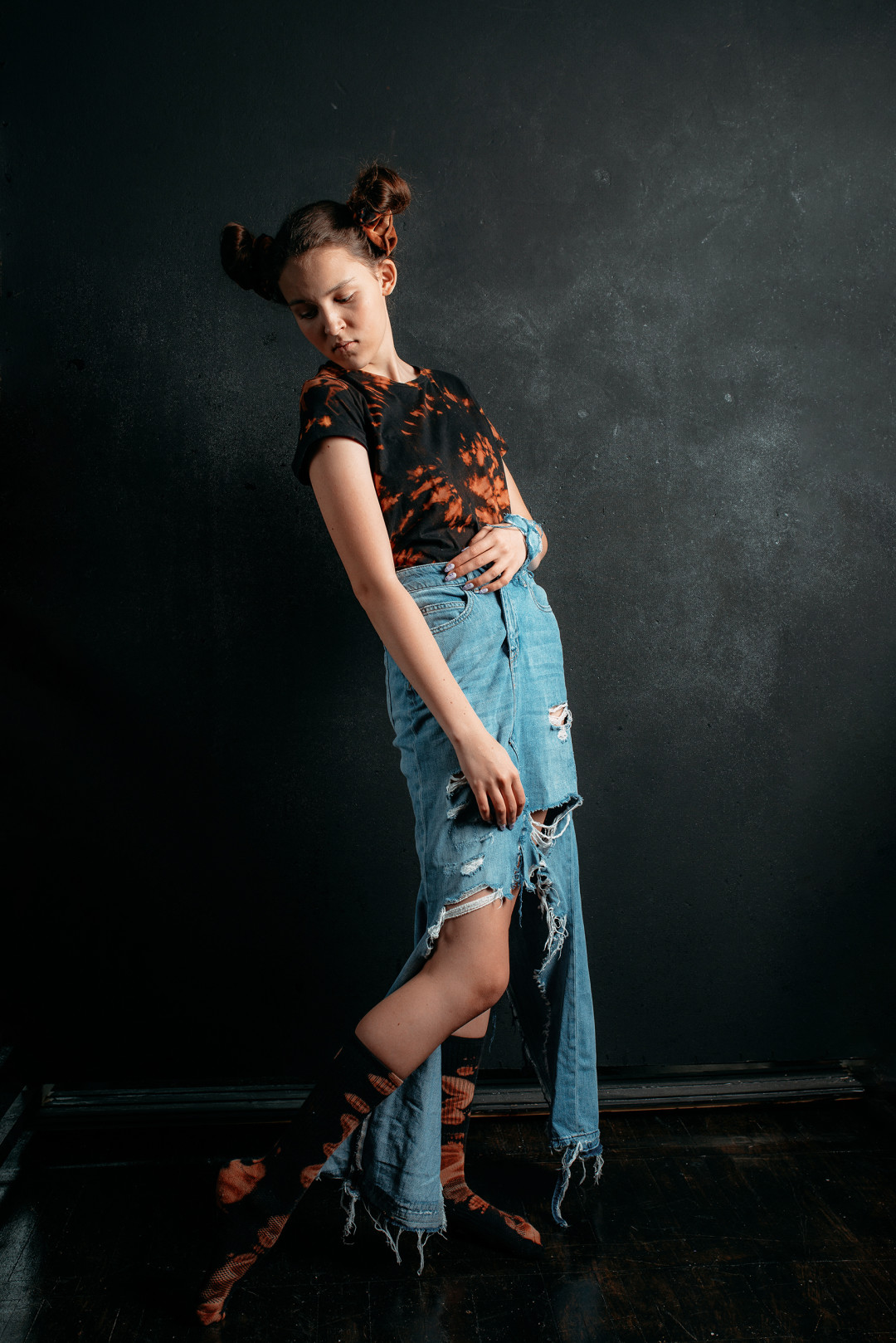 «Сейчас мы стали частью мировой моды — апсайклинга. Если простыми словами апсайклинг — это вторичное использование старых вещей, а еще главный тренд сезона весна-лето 2021. Недавно прочитали, что тренд уже подхватили Balenciaga, создав мохнатое пальто из «шнуркового меха», Miu Miu с коллекцией платьев, перекроенных из винтажного гардероба. «Ну а чем мы хуже?» — подумали мы с Настюхой. Взяли джинсы и футболки, придумали авторские принты и, вуаля, новая коллекция в духе осознанного потребления и экологичности готова!»