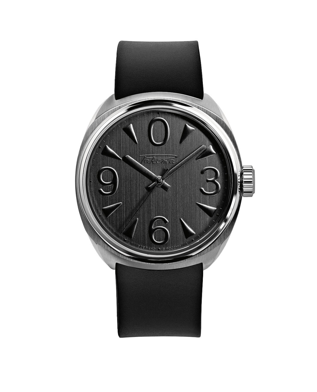 Бестселлер «Ракета» Big Zero переодели на Петродворцовом часовом заводе в черный бархат ради коллаборации с Артемием Лебедевым. Визуальный шум на минимум: даже задняя крышка часов затонирована так, что сквозь нее едва виден автоматический механизм с черным ротором.