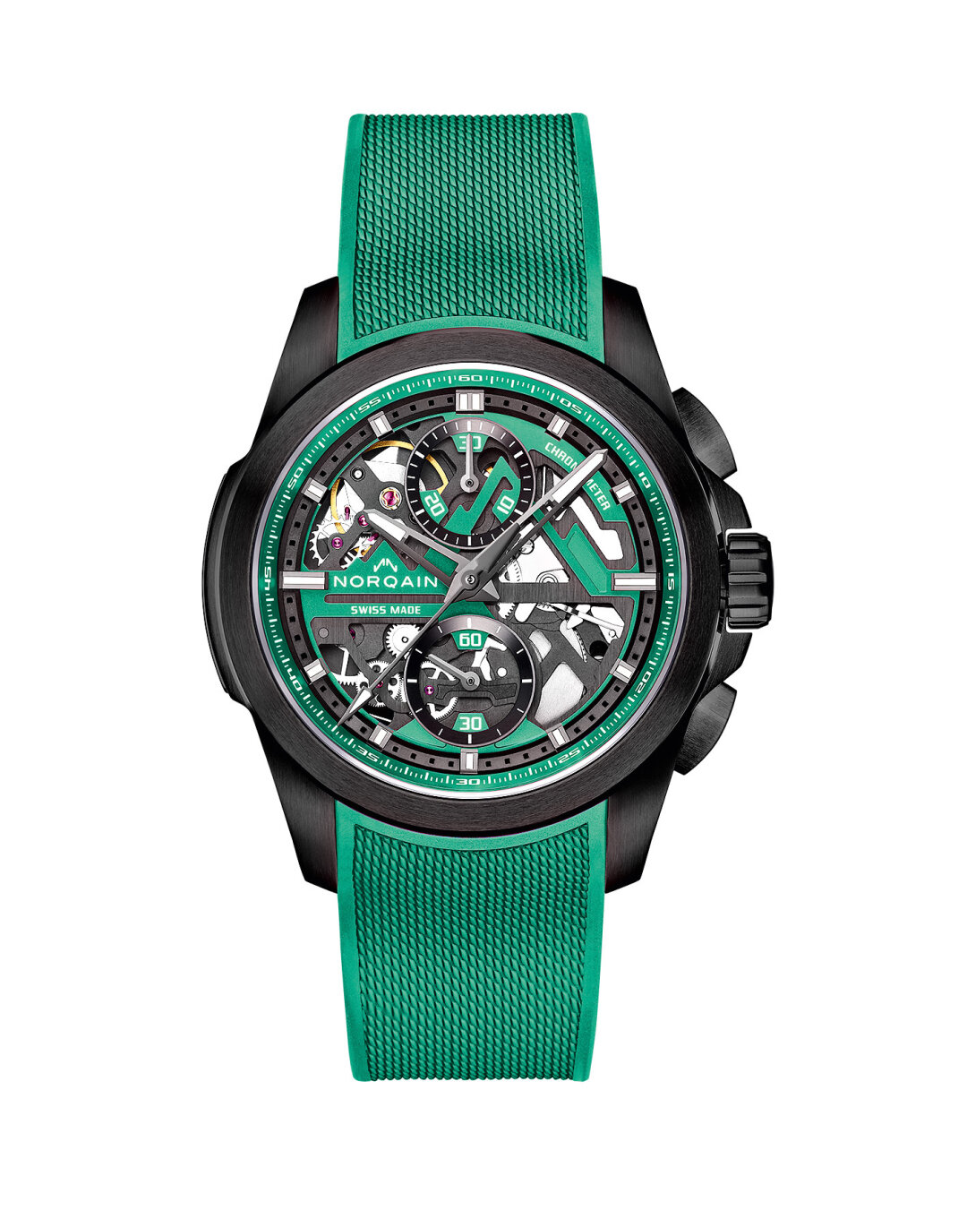 Флайбек-хронограф в коллекции Norqain (пронумерованная серия из 500 штук!) носит имя Independence Skeleton Chrono, корпус из наилегчайшего титана 5 Grade и нефритово-зеленые детали скелетонированного механизма с запасом хода в 62 часа.