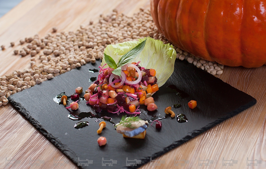 Наш винегрет по-узбекски только визуально похож на русский прототип. Все ингредиенты в нем заменены либо приготовлены нетрадиционным для популярного домашнего блюда способом. Сама сборка блюда несложная – перед подачей тарелку оформляют тыквенным маслом, винегрет выкладывают на салат «Айсберг». Рядом с ним – нечто вроде моей вольной трактовки японских нигиридзуси - обжаренный картофельный ломтик с кусочком слабосоленой скумбрии.