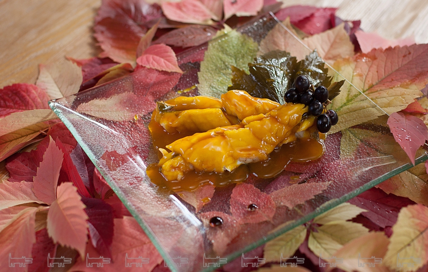 Рыба «Виноград» сибас, ошпаренный в воге под сливовым соусом