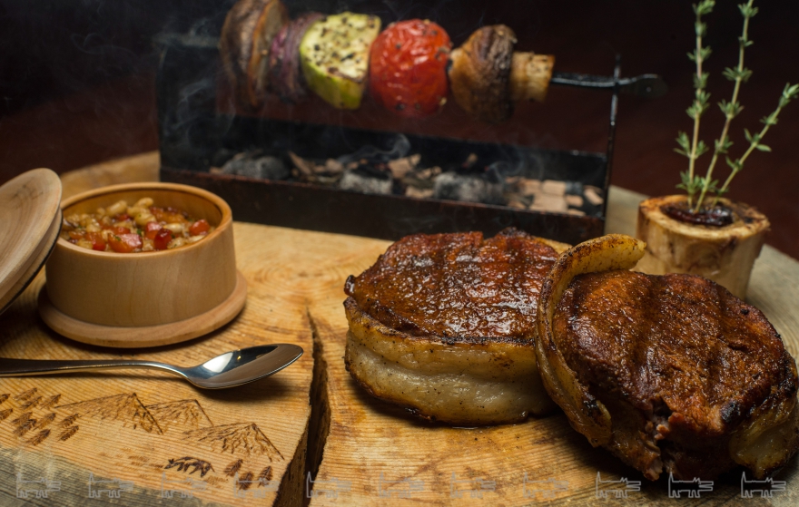 «Максус»: взял 2 медальона из вырезки, обернул в бараний курдюк и пожарил на живом огне. Для маринада: кориандр, зира, перцы - розовый, зеленый и черный, свежий розмарин, чеснок и смесь сливочного и растительного масла.