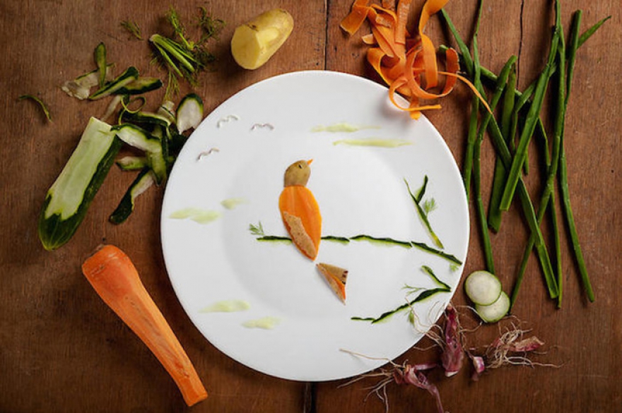 Малазийская художница и архитектор Хонг И использует в качестве холста белую тарелку. Это единственный несъедобный элемент композиции — пейзажи и бытовые сценки сложены из овощей, фруктов, круп и соусов.