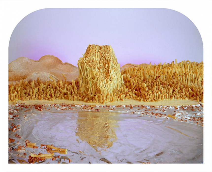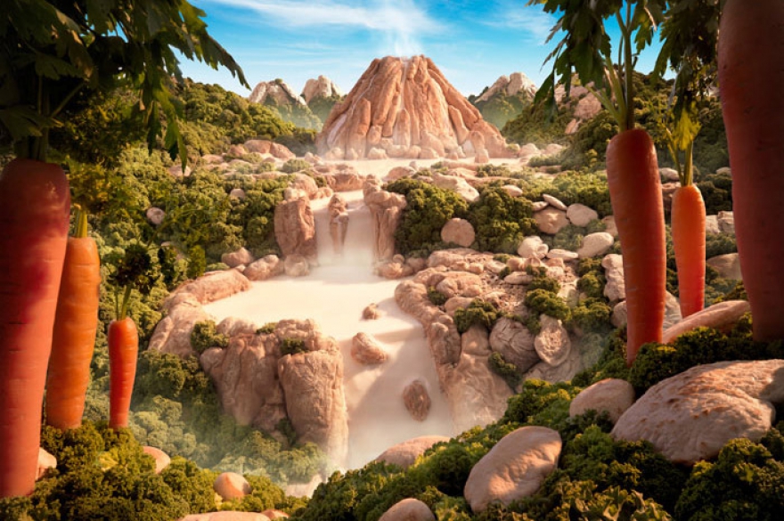 Английский рекламный фотограф Карл Уорнер в рамках фуд-арта придумал целый собственный жанр фотоискусства под названием «фудскейп». Все его моря из капустных листьев, сырные горы, деревья из петрушки и дома из пасты потрясающе натуралистичные и обаятельные.