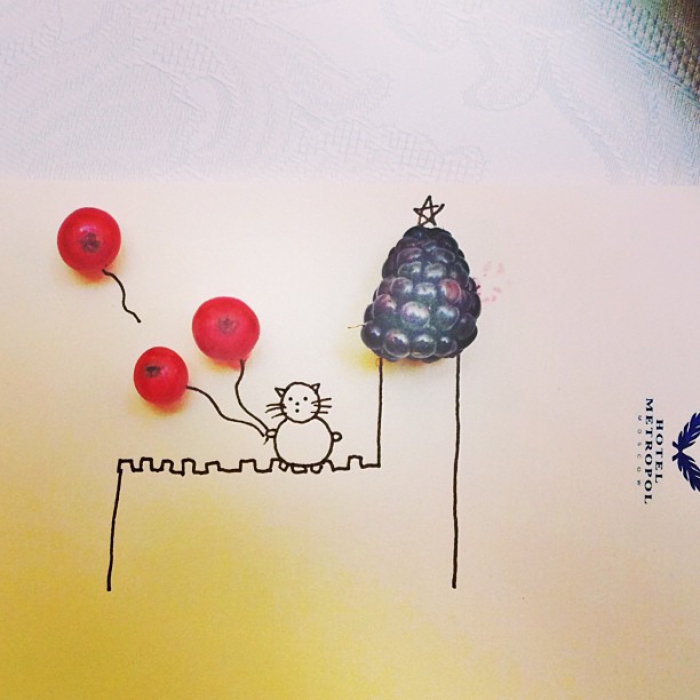 Главный редактор журнала «Собака.ru» Яна Милорадовская завела #murlokotam около двух лет назад — под таким хэштегом в ее личном инстаграме (@miloradovskaya) начали появляться графические работы со съедобными элементами. Лирический герой — минималистичный котик — катался на лыжах в малиновых рощах, наряжал новогоднюю елку игрушками из красной смородины, запускал воздушные шары из черники и даже взбирался на ежевичную кремлевскую башню.