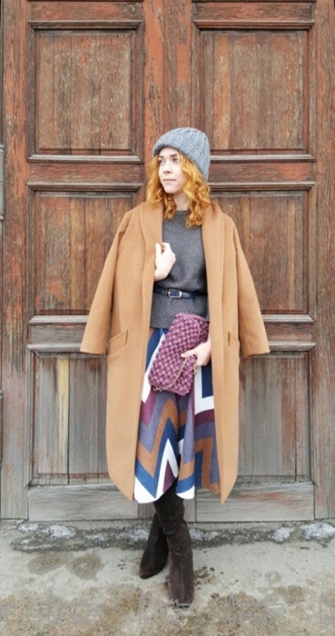 Образ Александры мне очень импонирует, тем, что все в нем в диалоге и в тонкой игре между собой: серая шапка коррелирует к цвету свитера, цвет пальто, поясок и сумочка к полоскам зигзага на юбке. Орнаментальный принт, как и пальто oversize, бесспорные мастодонты среди трендов последних сезонов, и обороты сбавлять похоже не намерены. Немного смущает цвет обуви, на мой вкус, было бы идеально, если они были бы серыми, но при этом мне очень нравиться, что они замшевые и матовые – именно к этому осеннем образу – это идеальная текстура.