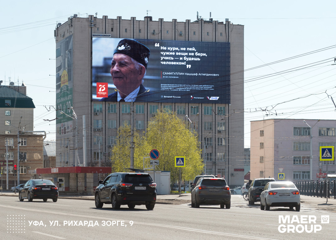 Накануне празднования 75-летия Великой Победы на медиафасадах крупнейшей в России по площади рекламных конструкций федеральной сети MAER GROUP были показаны фотоработы проекта «75 правил жизни победителей». Уникальный проект показал ветеранов и как победителей, награжденных орденами и медалями, и как наших мудрых бабушек и дедушек.