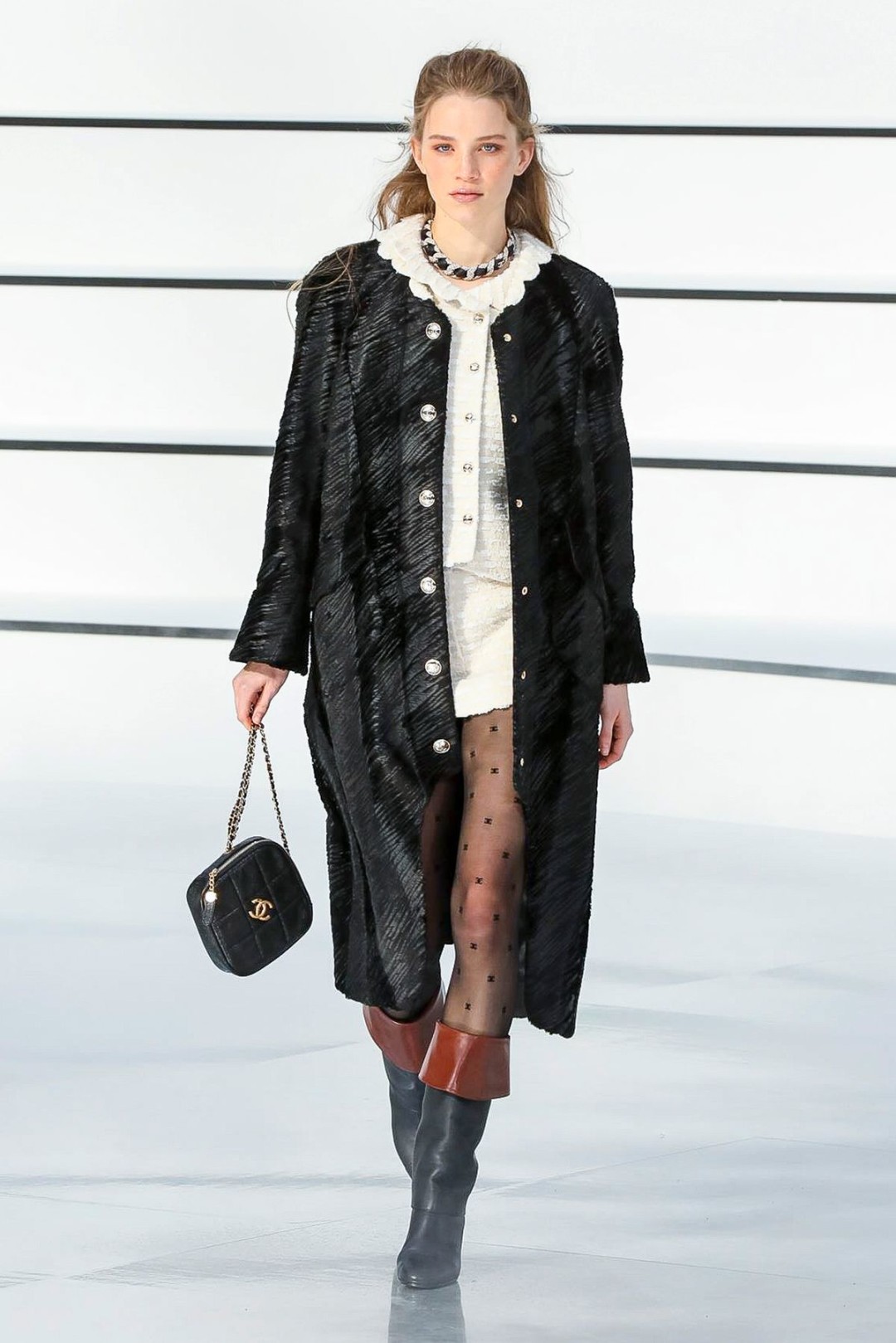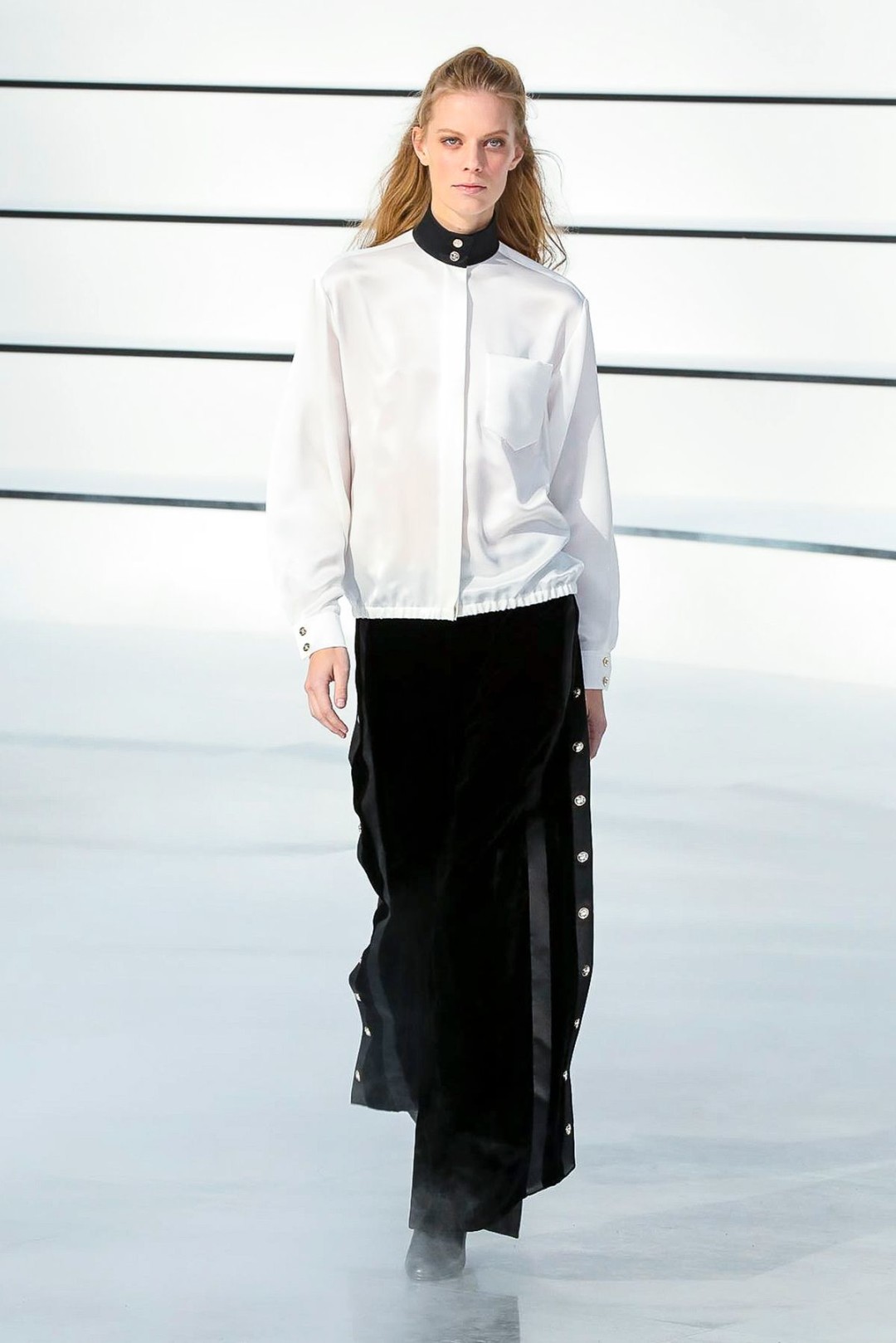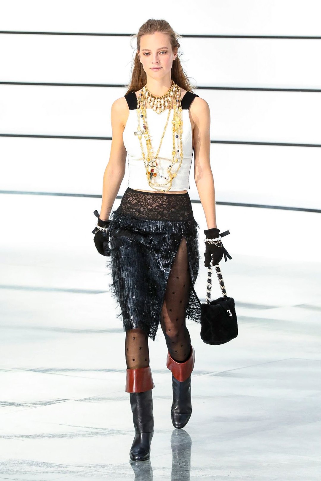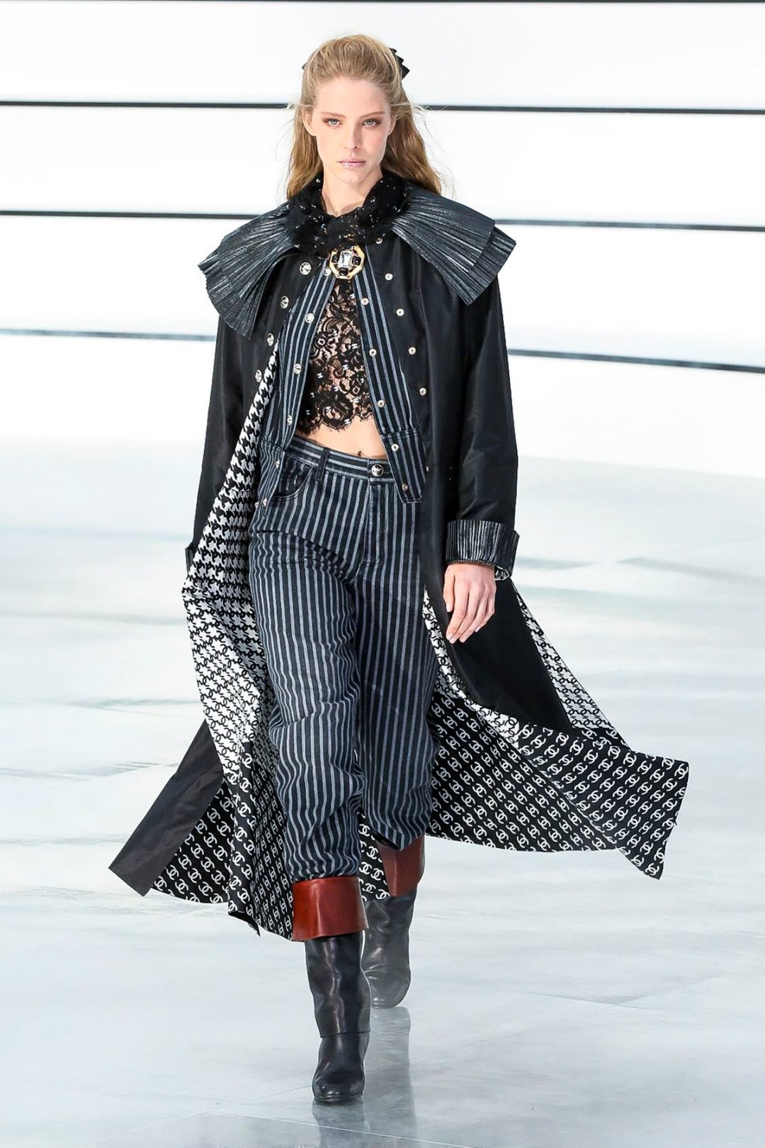 Показ закрыла Джиджи Хадид – в черном топе с нашивкой, колготках с логотипом Chanel и в сапогах с отворотами она вышла на подиум в сопровождении двух моделей, одетых в белое. В шоу также приняла участие петербурженка Алина Болотина, которая ранее представляла в Париже коллекции Loewe и Saint Laurent.