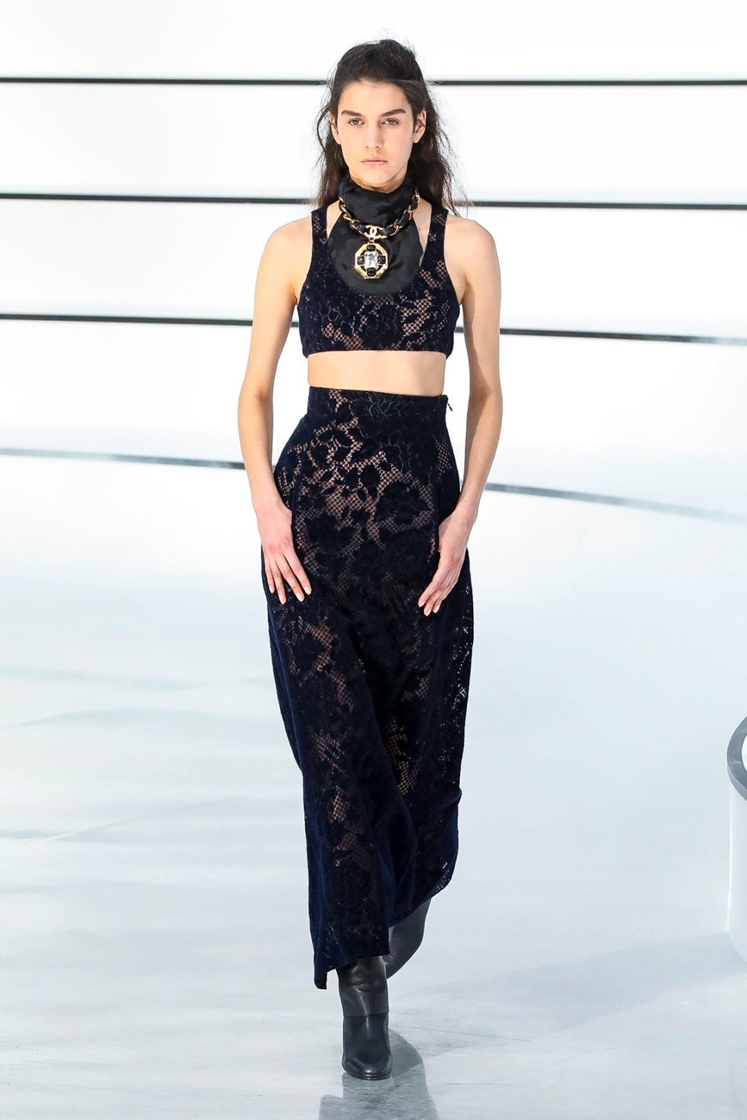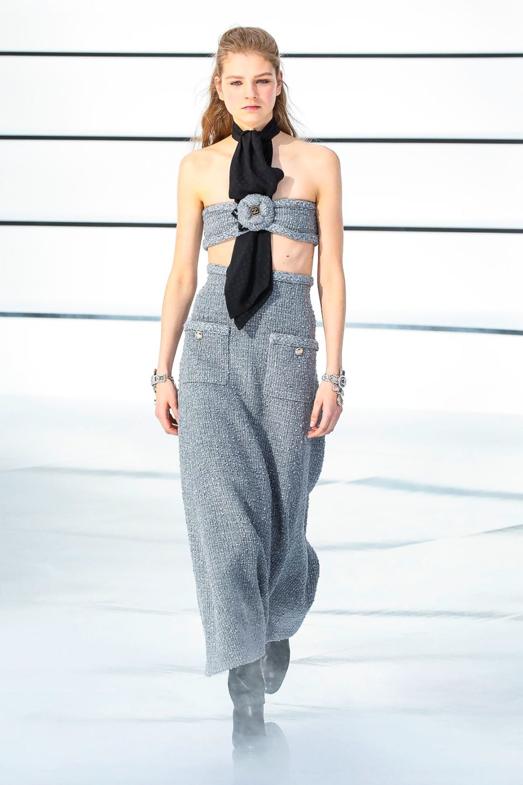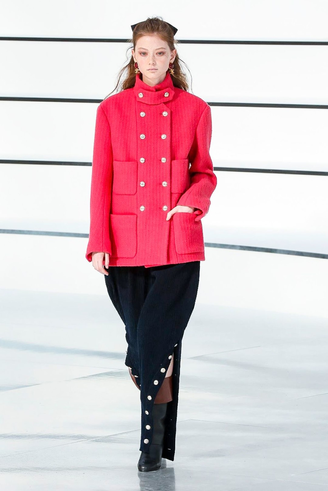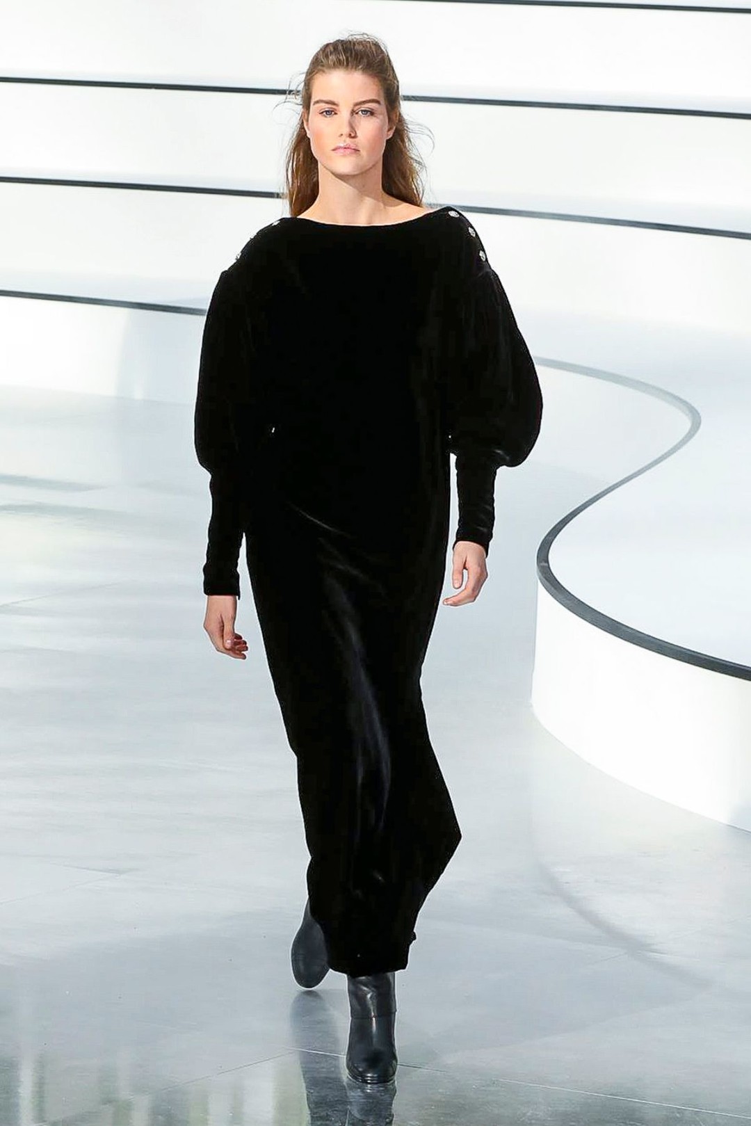 Показ закрыла Джиджи Хадид – в черном топе с нашивкой, колготках с логотипом Chanel и в сапогах с отворотами она вышла на подиум в сопровождении двух моделей, одетых в белое. В шоу также приняла участие петербурженка Алина Болотина, которая ранее представляла в Париже коллекции Loewe и Saint Laurent.