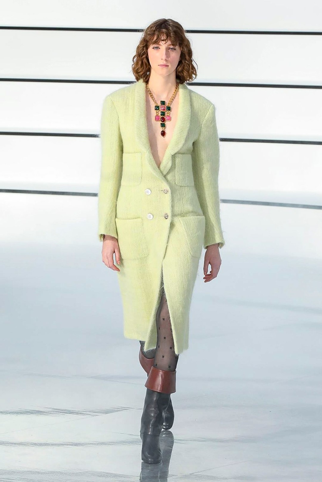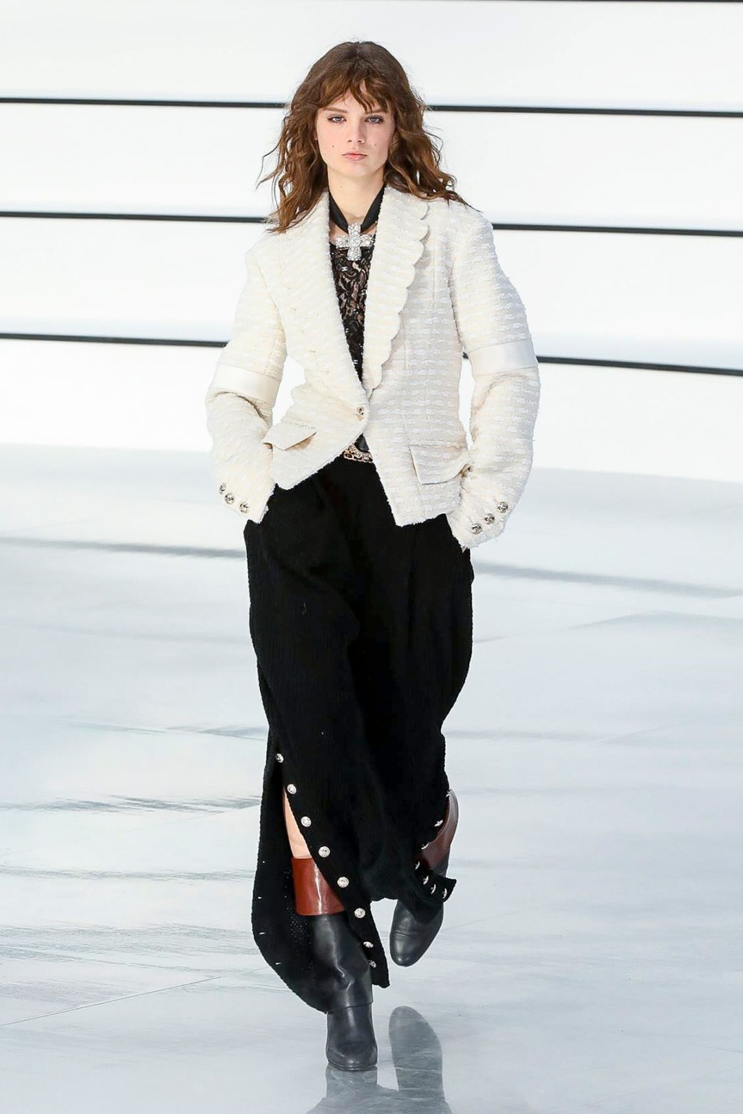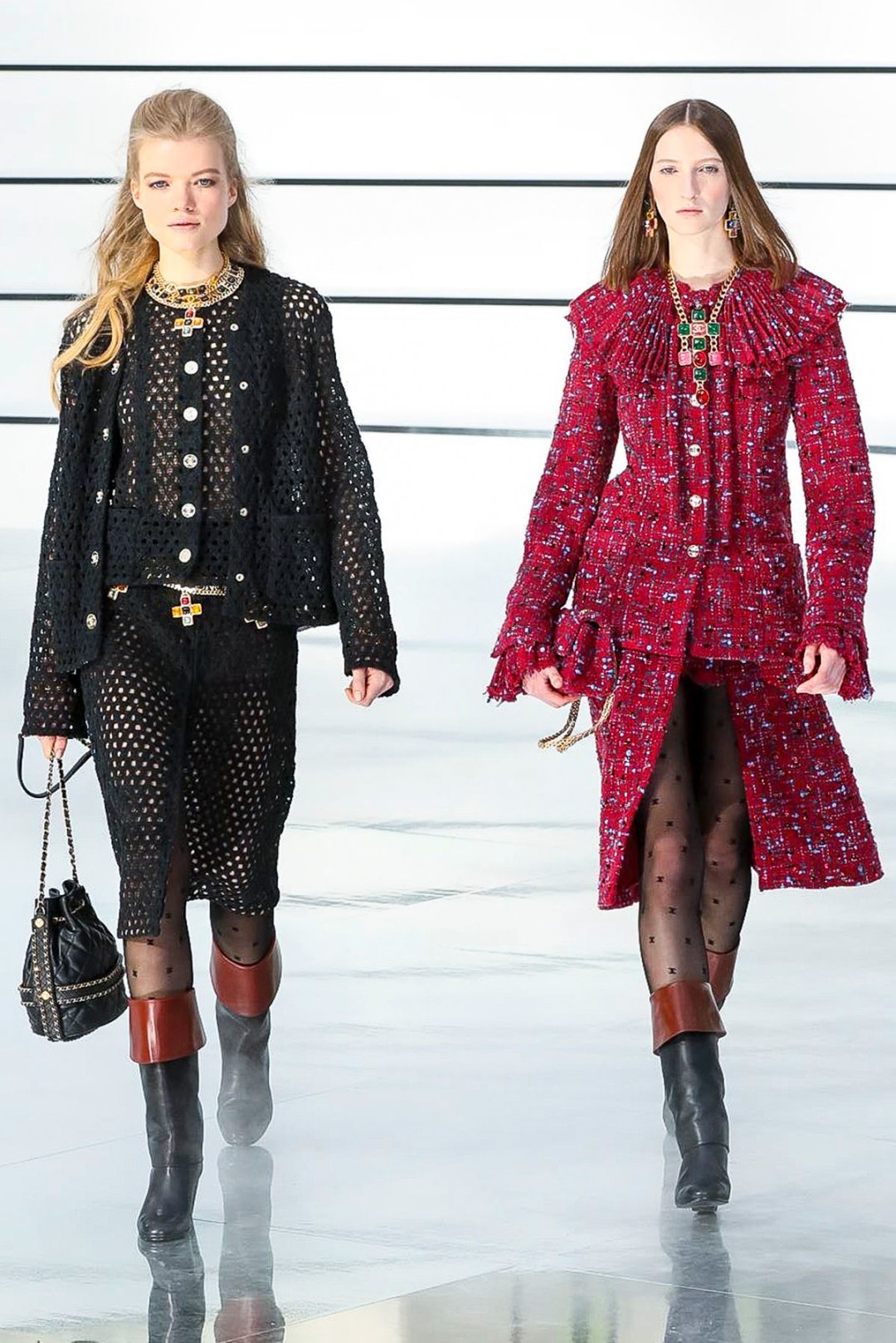 В Гран-Пале в Париже прошел показ осенне-зимней коллекции Chanel, в которую вошли длинные юбки с разрезами и кнопочной отделкой по краям, костюмы-тройки оттенка лимонного тарта и разноцветные кардиганы, напоминающие витражи в католических базиликах.