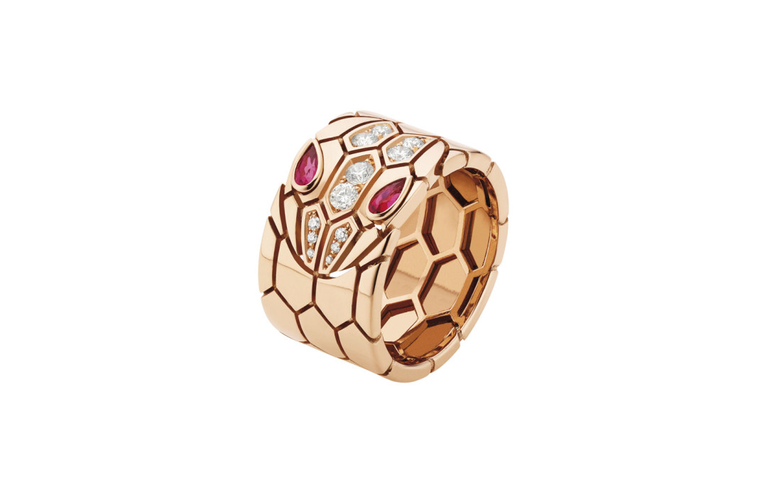 Сжатая до 2D змейка на широком кольце из розового золота сердито сверкает рубеллитовыми глазами и испариной в 0,25 карата бриллиантов.