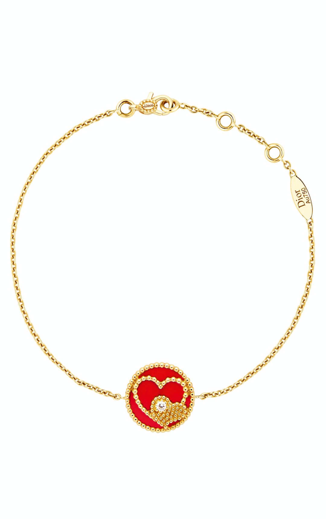 Красные шерстяные нитки на запястье — so last season. Предлагаем альтернативу: тонкий браслет с сердцем, выложенным на красной керамике крупинками золота. Трогательно, но крепко.