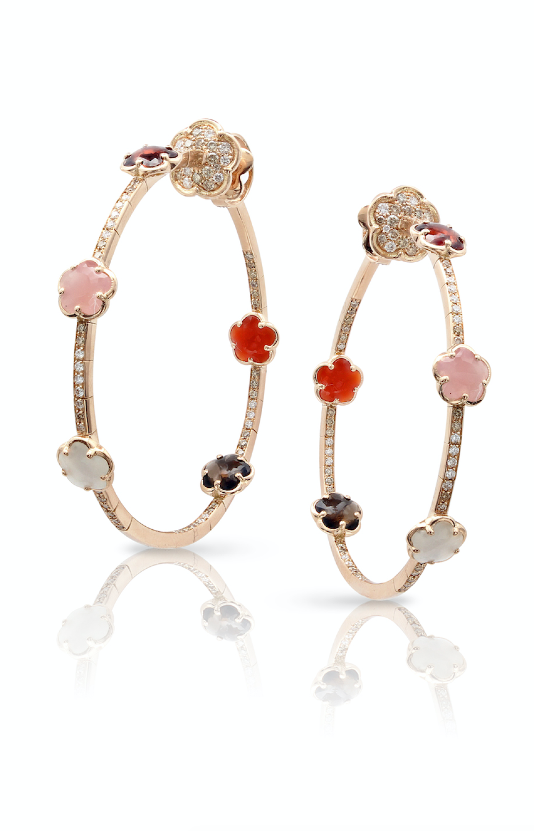 Серьга-обруч с инфантильными цветками из розового халцедона, перламутра, дымчатого кварца, сердолика и красного граната — это два супертренда-2020 в одном. А если носить ее сольно — то сразу три.