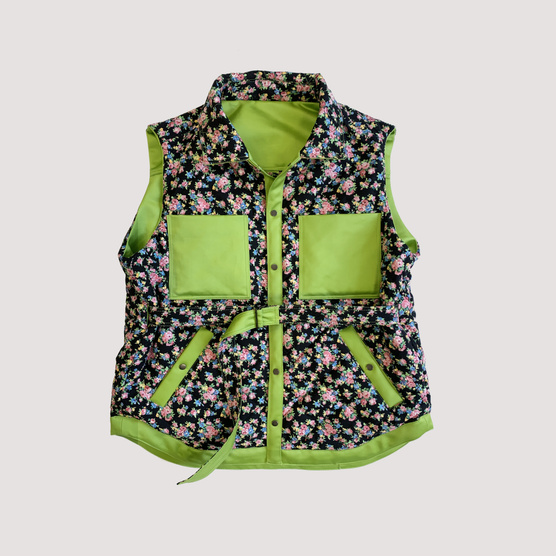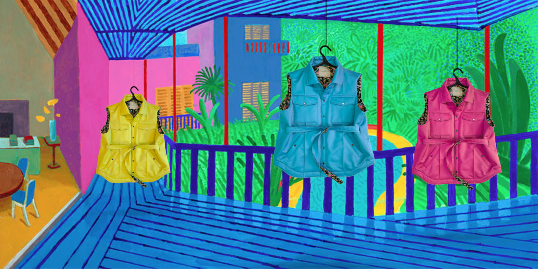 Погрузившись в творчество Хокни, команда бренда создала вещи в цветах, в которых работал художник – насыщенно-желтом, апельсиновом, пурпурно-розовом, небесно-голубом, салатовом и зеленом. Жилеты (они все двусторонние!) сделаны из плотного сатина, а подкладка выполнена в классическом для марки стиле – из утепленного стеганого батиста «в цветочек».