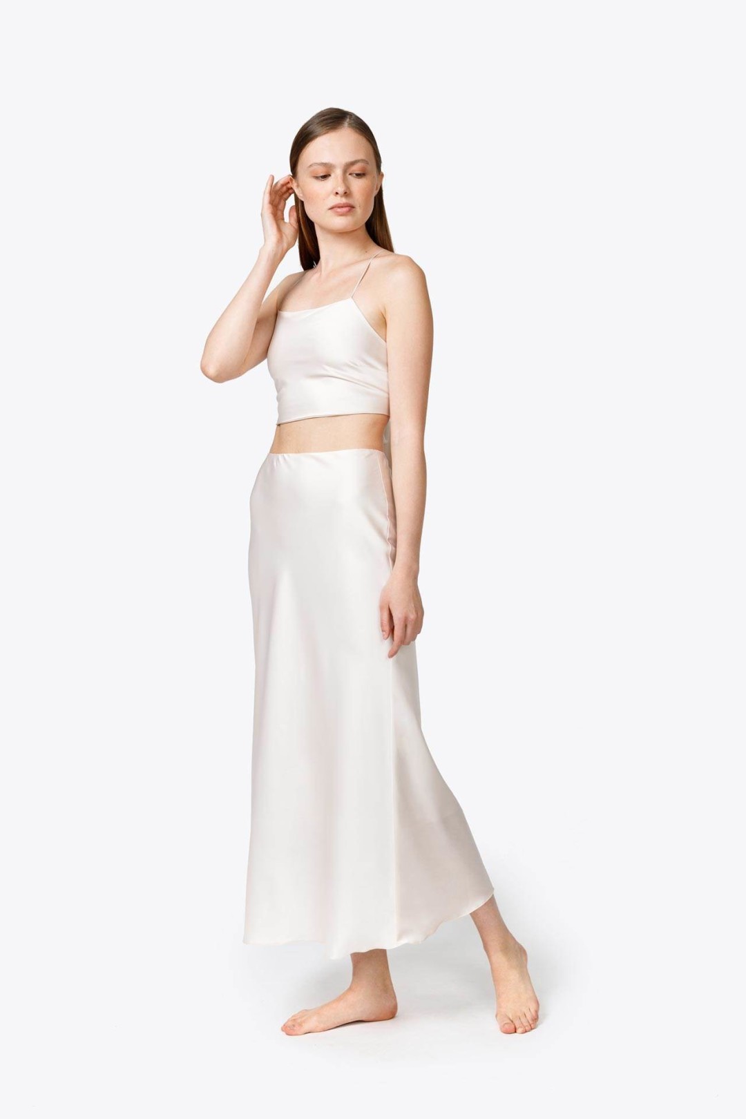 Марка Нелли Недре создает базовые вещи, комфортные для ношения day-to-day. Невесомая юбка бельевого типа будет основой десятков повседневных и «особенных» образов – надеваем вместе с оверсайз-свитшотом, кашемировым кардиганом и кроп-топом тон в тон.