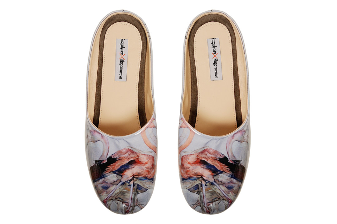 Тапочки Razgulyaev Blagonravova в коллаборации с петербургским художником Костей Федоровым покрыты эластичной пленкой, которая устойчива к внешним превратностям погоды. Украшенные изображениями фламинго, они станут атмосферным элементом домашнего уюта во время карантина и примечательным аксессуаром после него.
