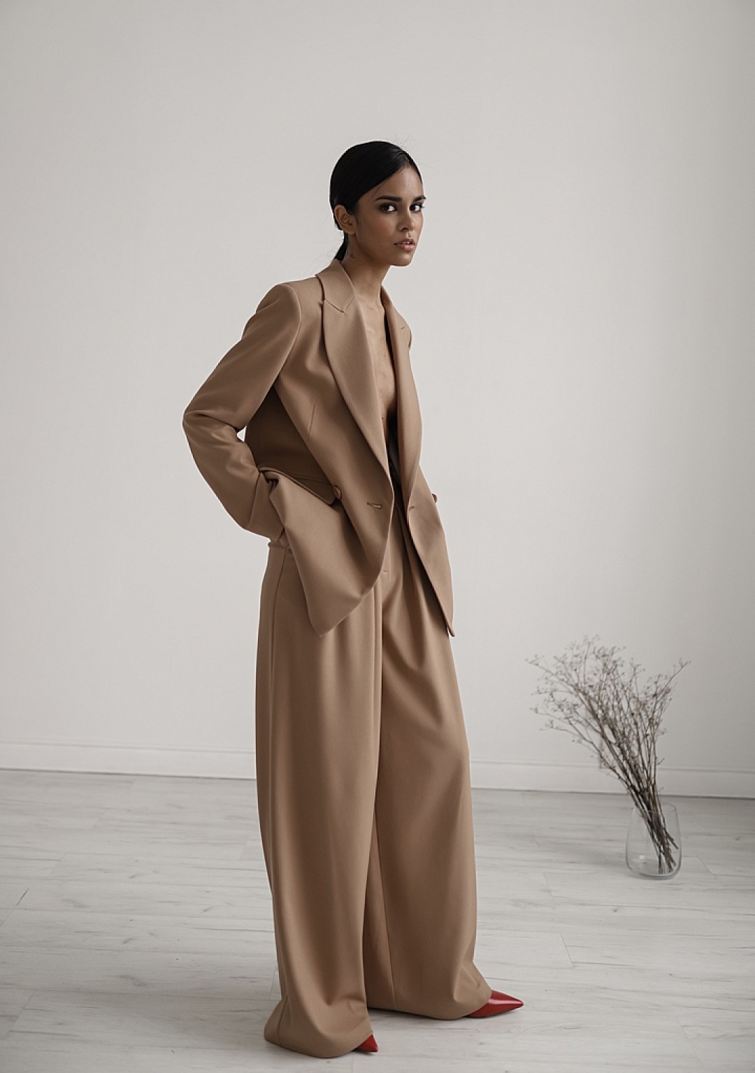 Оверсайз-костюм цвета какао с молоком – еще одна базовая вещь любого гардероба. В нем и на работу, и на прогулку, и на свидание – удобно, классно и всегда выигрышно.